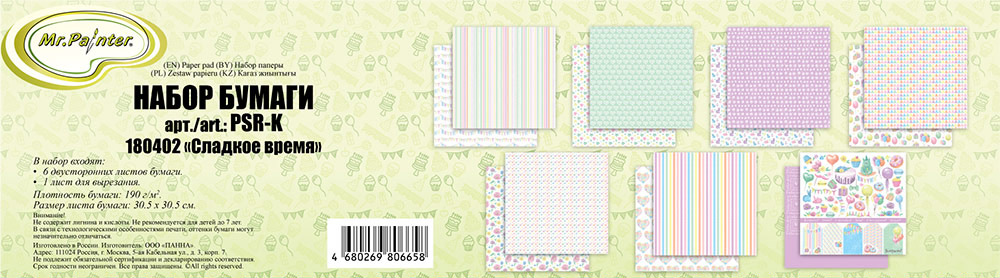 Бумага для скрапбукинга "Mr.Painter" PSR-K Набор бумаги для скрапбукинга 190 г/кв.м 30.5 x 30.5 см 7 л. 180402 "Сладкое время"