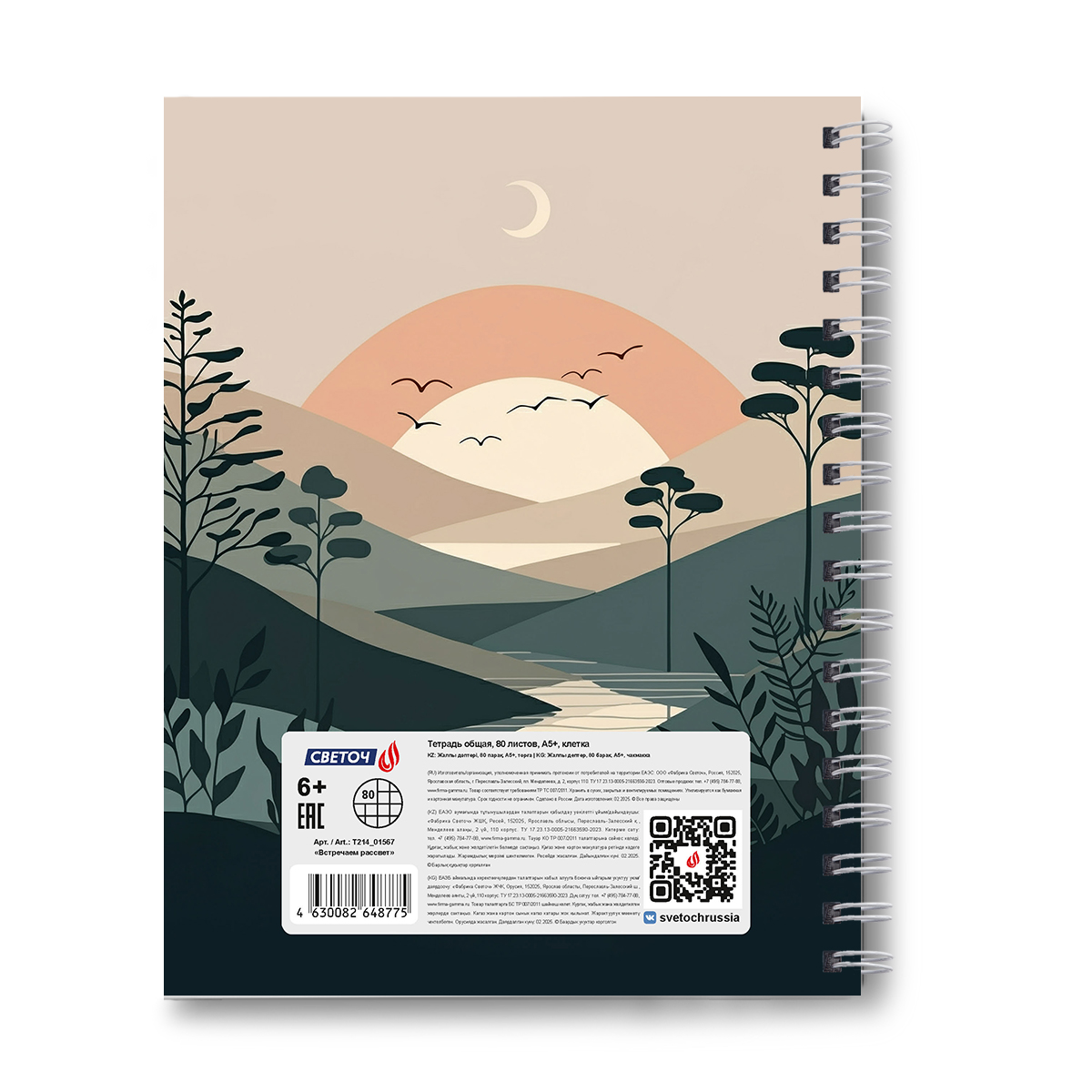 "Светоч" Т214 Тетрадь общая с твердой обложкой, матовая ламинация A5 80 л. на гребне 65 г/кв.м , белизна 100 % клетка 01567 Встречаем рассвет