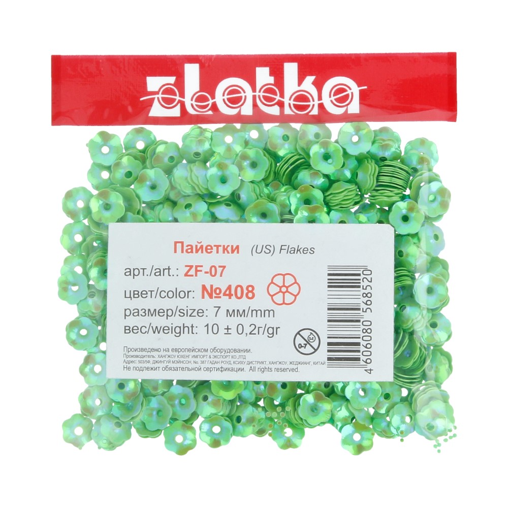Пайетки "Zlatka" россыпью ZF-07 7 мм 10 г №408 салатовый